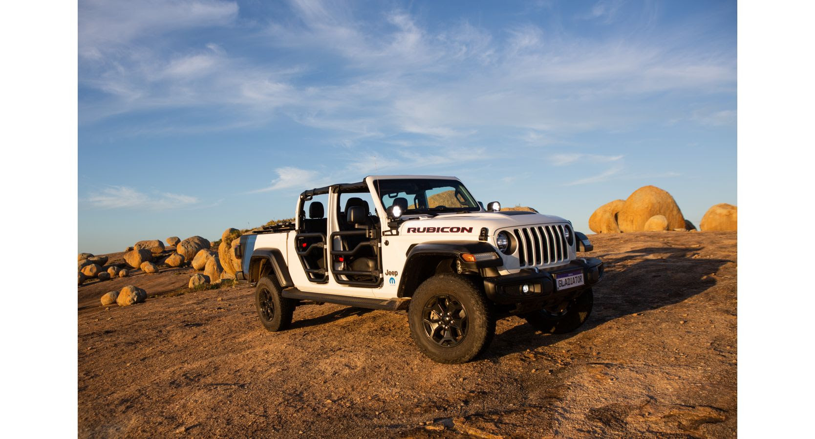 Para mostrar uma fração dessas possibilidades, a Mopar equipou um Jeep Gladiator Rubicon na cor Branco Bright com mais de dez itens do portfólio, entre os quais se destacam: