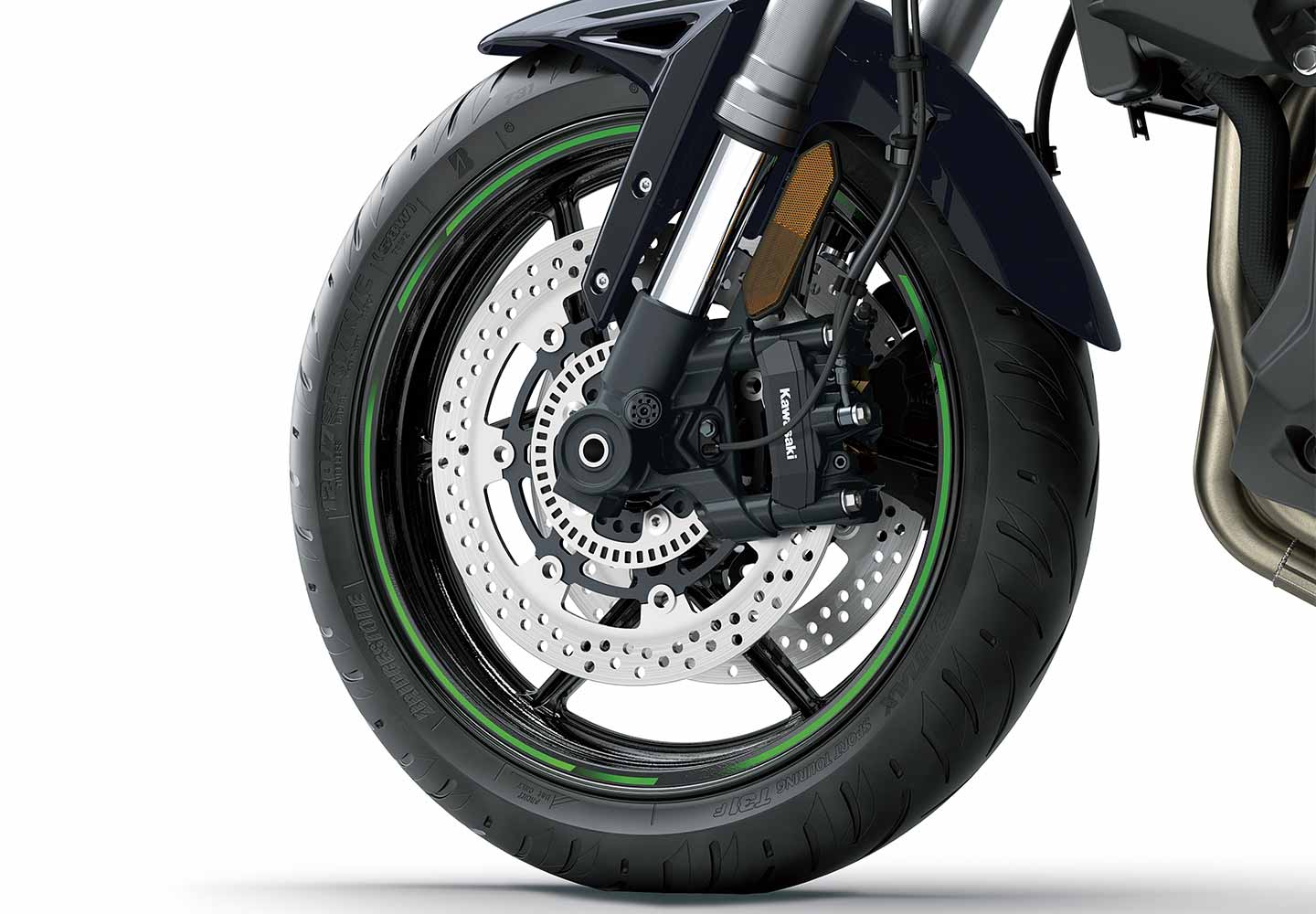 As rodas de 17” utilizam pneus nas medidas 120/70-R17 na dianteira, e 180/60-R17 na traseira. Poderosos e progressivos em seu funcionamento, os freios dianteiros são compostos por discos de ø310 mm com pinças radiais monobloco de 4 pistões. Na traseira, o disco de ø260 mm complementa o sistema KIBS com ajuste fino da pressão hidráulica.