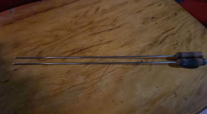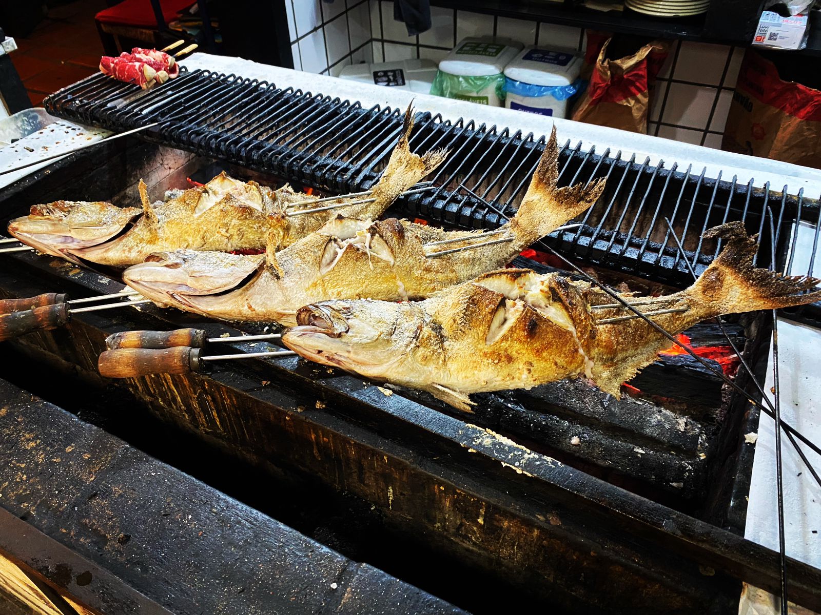 Amigos que ficaram na fábrica presentearam os irmãos com alguns espetos (duplos) que permanecem firmes até hoje, grelhando a anchovas na brasa, há 39 anos.
