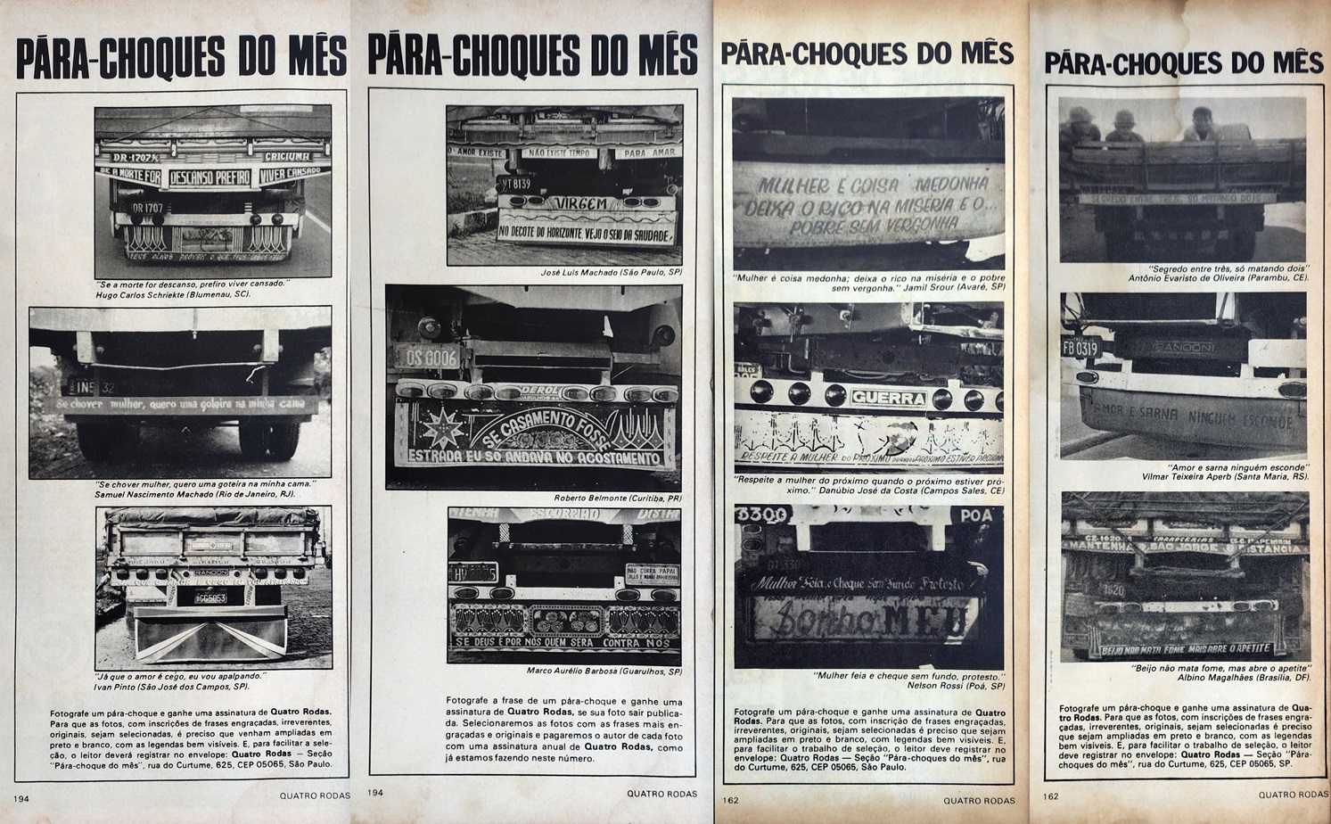 Freio a árvore”, “Segredo entre três? Só matando dois”, “Baijo não mata fome, mas abre o apetite”, “Mulher, só a minha”, “Se Deus ó por nós, quem será contra nós?”, “Se a morte for descanso, prefiro viver cansado”, eram coisas que se lia na 4 Rodas e muito mais pelas estradas.