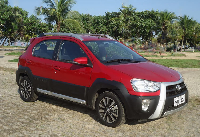 Na onda dos carros com estilo aventureiro a Toyota pegou seu compacto, Etios, e fez o Etios Cross. O carro é feito em cima da versão XLS, que é a top, e tem modificações em seu visual mantendo a mecânica 1.5 16V Flex que desenvolve 96,5 cavalos, mas mantendo a mesma altura do solo, o que não ocorre nas versões semelhantes da concorrência, em relação aos seus modelos originais. Externamente o visual apresenta grade preta com apenas uma barra no meio com tomada de ar maior. Várias molduras nas cores preto e prata envolvem a parte inferior do carro e no teto barras na cor prata. Os retrovisores externos são elétricos , na cor da carroceria e possuem as luzes do pisca integradas. Os faróis receberam um apêndice que mudou o contorno e são do tipo máscara negra, as luzes de neblina tem molduras prata e as rodas tem desenho exclusivo, com acabamento em tom preto e prata. No interior o painel esta mais refinado com materiais mais sofisticados, aliás isso acontece em toda linha Etios, mas continua muito pequeno o quadro de informações onde consta o nível de combustível. No interior a novidade da versão Cross é a costura branca nos bancos que levam o logo, que identifica a versão, em alto relevo. O Etios Cross custa R$3.150 a mais que a versão top, XLS, e seu preço é R$48.240.