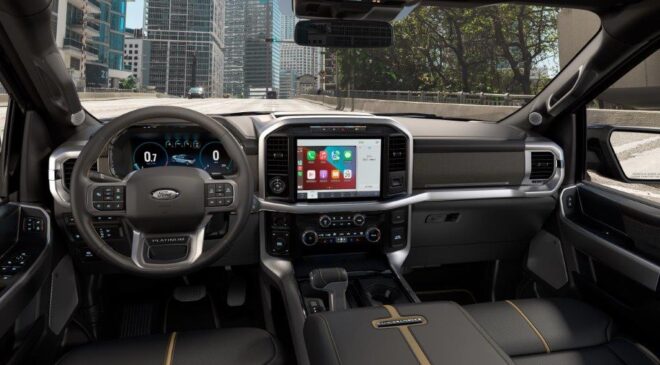Muita resistência também no painel de instrumentos em tela digital, configurável, de 12” e o sistema multimídia marca a estreia do sistema da Ford denominado Sync 4, em outra tela de 12”, e com um processador duas vezes mais potente. Na sua tela não é monitorada apenas uma câmera tradicional de ré mais sim uma visão 360º. Para o F-150 também existe o aplicativo Ford Pass que recebe muitas informações do carro e também possibilita o acionamento de funções remotas. O sistema de som é da conceituada marca dinamarquesa Bang & Olufsen designada em pequenas placas com B&O na duas versões.