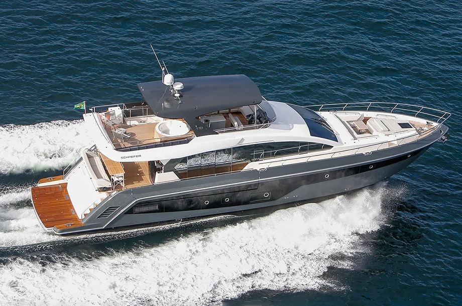 Representando a excelência da indústria náutica nacional, com design luxuoso e esportividade, este iate de 77 pés também foca na amplitude combinada com qualidade e conforto. O projeto traz varandas laterais retráteis que expandem o convés e criam ambientes contínuos entre o interior do barco e o oceano. Além da alta autonomia de navegação e quatro suítes, o flybridge foi recentemente atualizado com uma hidromassagem de última geração.
