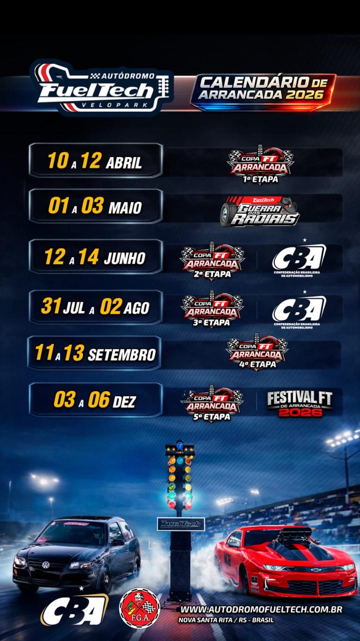 Prepare-se para 3 dias de muita adrenalina! Os carros e motos mais rápidos da América do Sul estarão presentes na Copa FT de Arrancada, que ocorrerá de 10 a 12 de abril no Autódromo FuelTech Velopark, em Nova Santa Rita (RS). Até dezembro, ocorrerão 5 etapas, que definirão o grande campeão. O calendário de arrancadas 2026 também terá a competição Guerra dos Radiais (1º a 3 de maio) e o 1º Festival FT de Arrancada (3 a 6 de dezembro). Além de assistir à competição na pista, o público poderá visitar os boxes, interagindo com os principais ídolos do automobilismo e os mais renomados influenciadores do setor. Na área de experiências, dezenas de empresas irão expor e comercializar produtos e serviços automotivos. Além disso, pela primeira vez haverá espaço kids e lounge VIP, garantindo total conforto para as famílias. Os ingressos são limitados e estão à venda no site oficial www.autodromofueltech.com.br.
