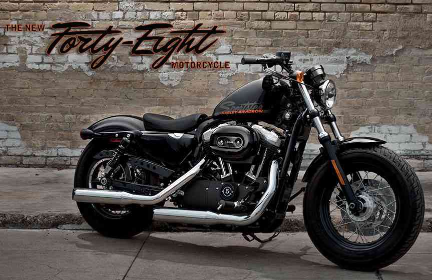 A parte dianteira da motocicleta apresenta um visual robusto, em razão do seu largo pneu MT90 que envolve a roda preta raiada. Outros destaques são os espelhos retrovisores montados sob o guidão que, com seu posicionamento mais à frente e combinado ao perfil rebaixado, proporciona uma posição agressiva de condução. Controles de mão mais ergonômicos também estão presentes, assim como o sistema eletrônico que permite a exibição de diversas informações no painel, como indicador de marcha e rotação do motor. A Forty-Eight® é oferecida nas cores Vivid Black, Amber Whiskey, Charcoal Pearl e nas pinturas especiais Hard Candy Cancun Blue Flake e Hard Candy Big Red Flake.