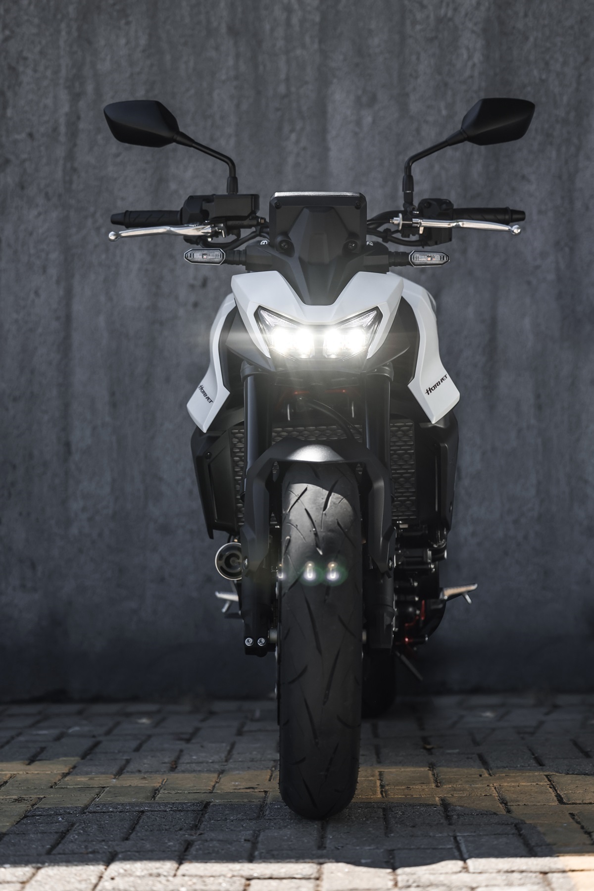 A riqueza de especificações técnicas da CB750 Hornet é enfatizada pelos faróis de LED emoldurados por uma agressiva carenagem, que confere ao modelo um visual esportivo. O painel TFT colorido de 5 polegadas assim como o comando de punho esquerdo retroiluminado são requintes que se unem aos indicadores de direção que se desativam automaticamente e ao sistema ESS – Emergency Stop System.