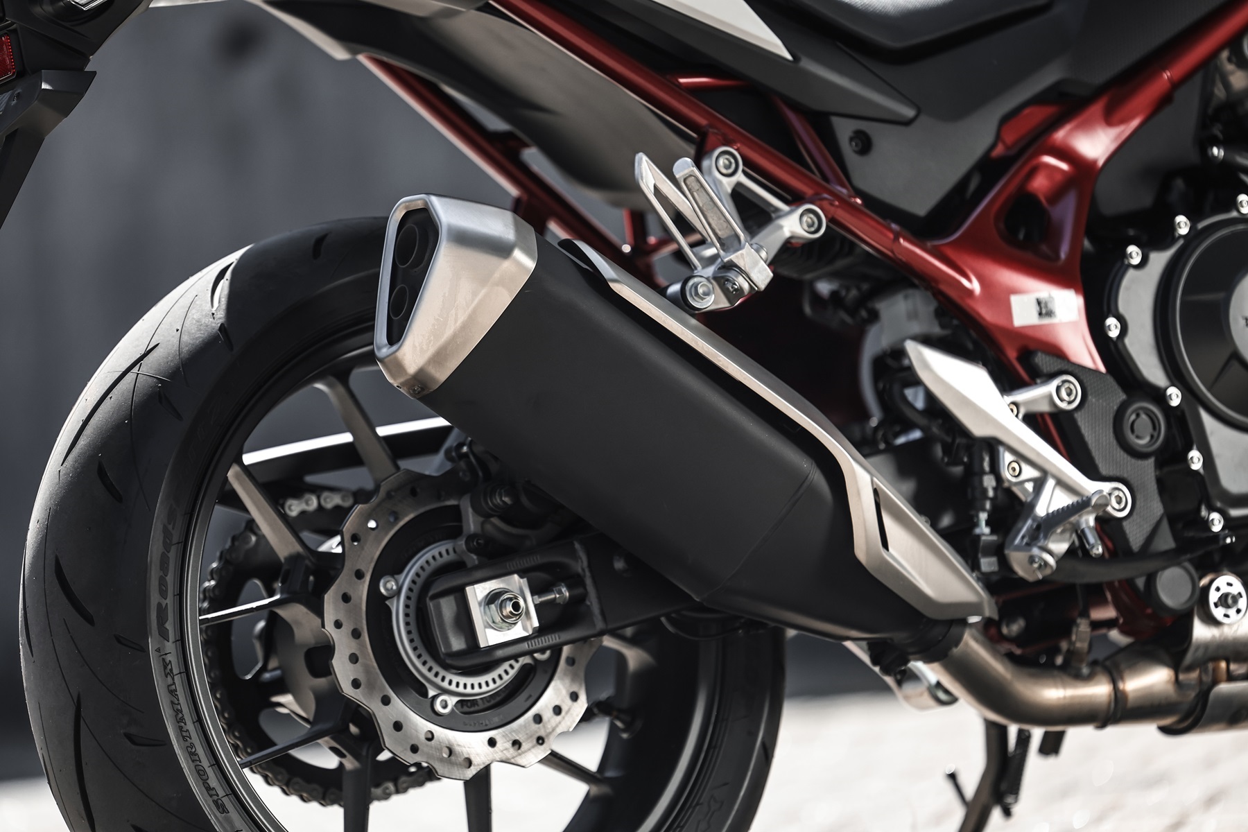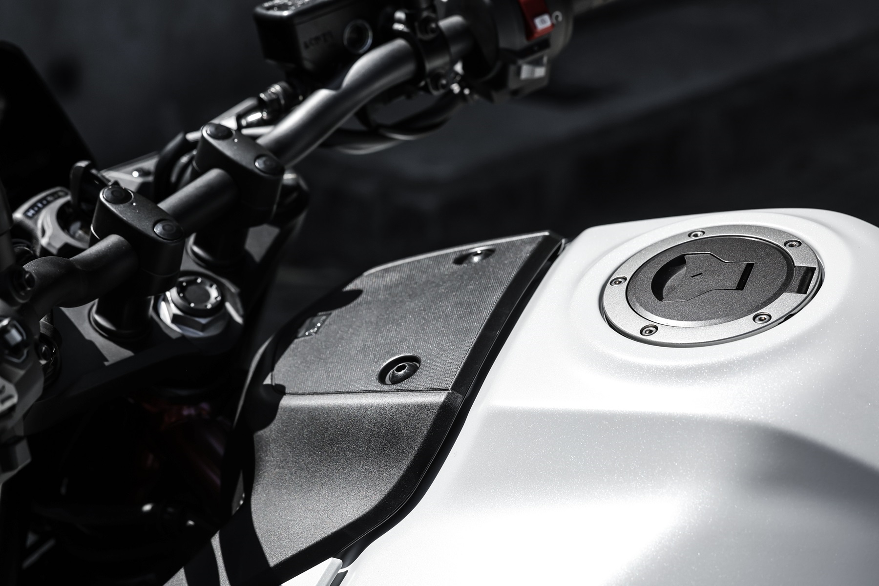 Para aceleração e retomadas rápidas, a tecnologia patenteada Vortex Flow Ducts cria um fluxo uniforme desde as tomadas de ar laterais até a caixa do filtro de ar, a partir da qual partem os dutos de admissão verticais. Os corpos de borboleta têm Ø 46 mm.