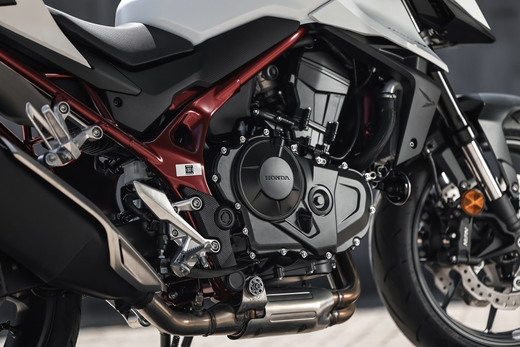 O motor da CB750 Hornet incorpora plenamente o avançado estágio da engenharia Honda em um pacote compacto. O motor bicilíndrico paralelo de 755 cc entrega 69,3 cv de potência máxima e 7,04 kgf.m de torque, cifras que se beneficiam da otimização derivada de um elaborado sistema de gestão eletrônica que oferece cinco modos de pilotagem selecionáveis.
