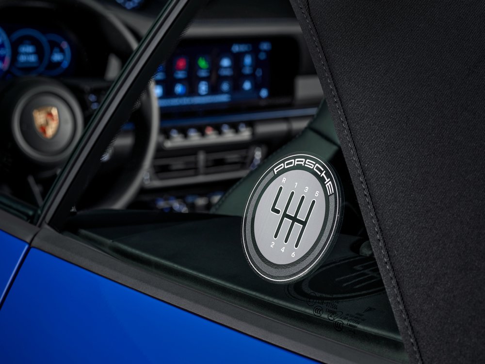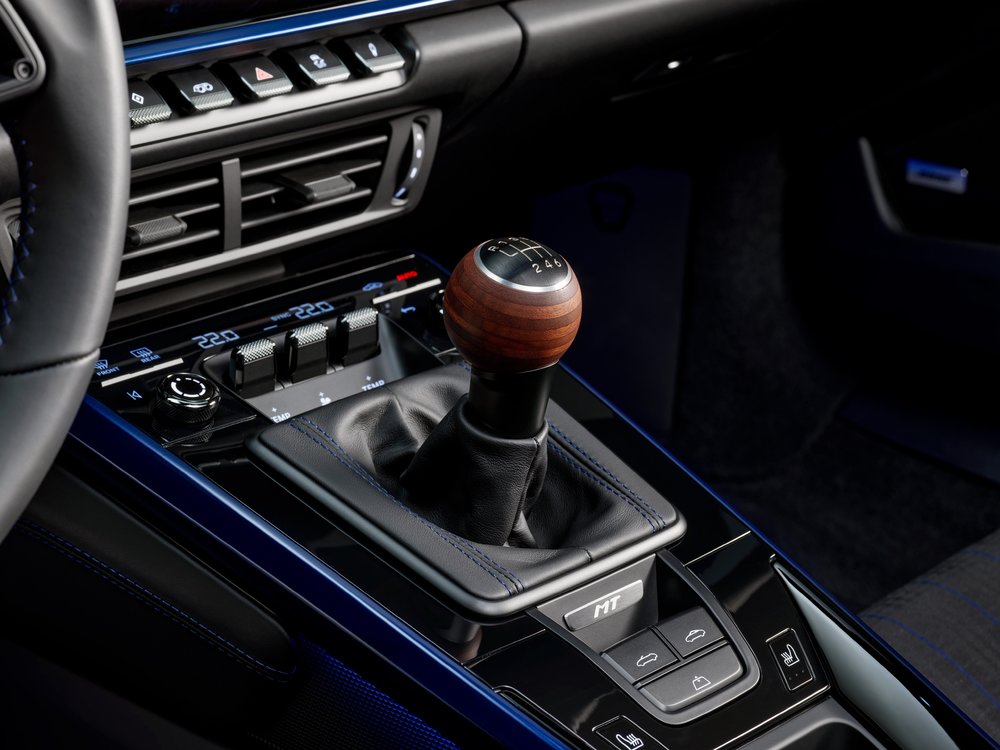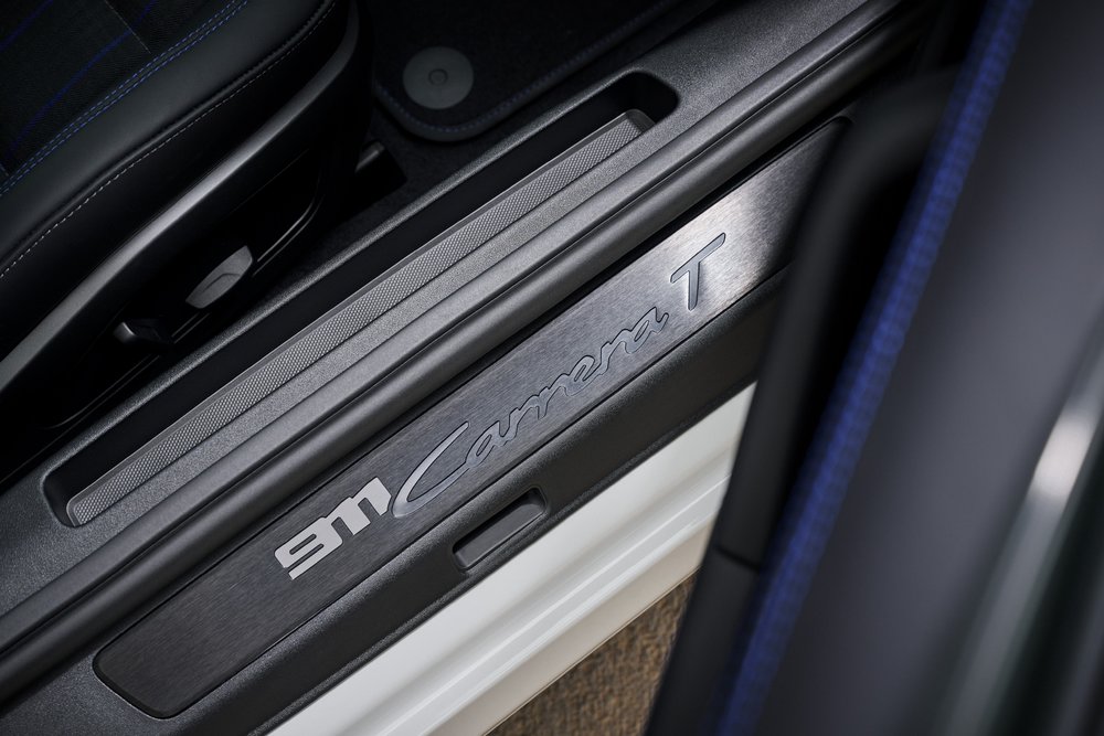 A Porsche deu ao interior do Carrera T um visual enfaticamente purista, típico do modelo T: esportivo e preto, com costura contrastante sob demand. O cronômetro do Pacote Sport Chrono é posicionado sob o painel. Vários detalhes especiais enfatizam a exclusividade do 911 Carrera T como um carro esportivo manual: a alavanca de câmbio encurtada é coroada com um pomo de câmbio de madeira laminada de nozes com poros abertos, que oferece uma experiência visual e tátil especial. Na frente da alavanca de câmbio, há um emblema com o logotipo ‘MT’ (Transmissão Manual). O logotipo do padrão de troca de marchas está impresso no lado do passageiro do painel.