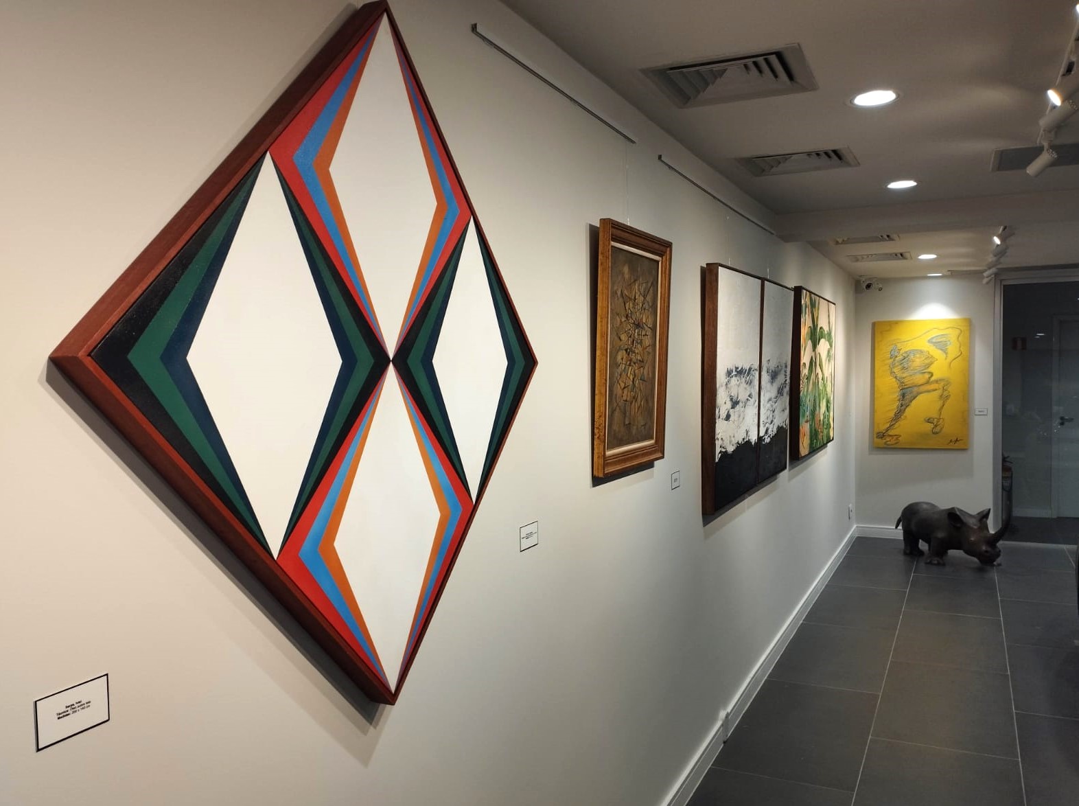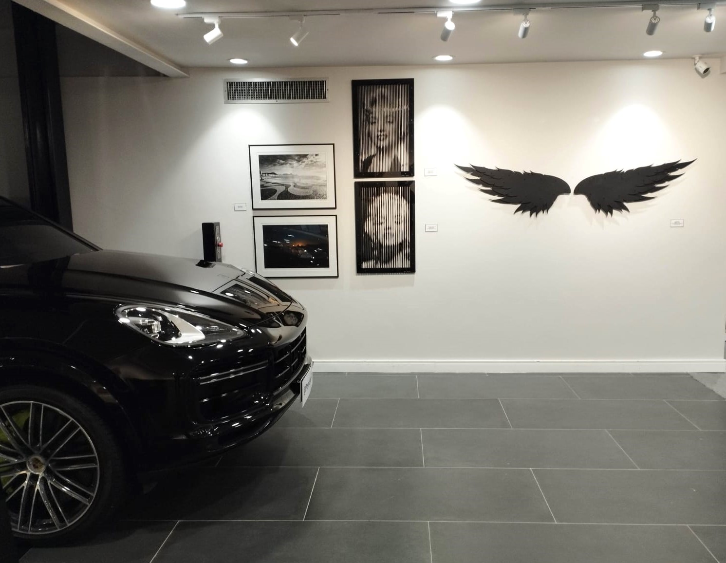 A galeria fica no subsolo da loja com quadros, fotografias, esculturas e tapeçarias fazendo a moldura para os carros.